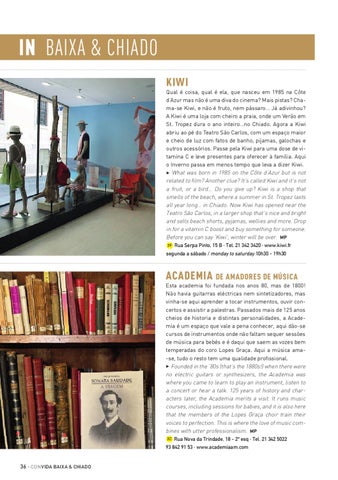 IN BAIXA & CHIADO KIWI Qual é coisa, qual é ela, que nasceu em 1985 na Côte d’Azur mas não é uma diva do cinema? Mais pistas? Chama-se Kiwi, e não é fruto, nem pássaro… Já adivinhou? A Kiwi é uma loja com cheiro a praia, onde um Verão em St. Tropez dura o ano inteiro…no Chiado. Agora a Kiwi abriu ao pé do Teatro São Carlos, com um espaço maior e cheio de luz com fatos de banho, pijamas, galochas e outros acessórios. Passe pela Kiwi para uma dose de vitamina C e leve presentes para oferecer à família. Aqui o Inverno passa em menos tempo que leva a dizer Kiwi. 3 What was born in 1985 on the Côte d’Azur but is not related to film? Another clue? It’s called Kiwi and it’s not a fruit, or a bird… Do you give up? Kiwi is a shop that smells of the beach, where a summer in St. Tropez lasts all year long… in Chiado. Now Kiwi has opened near the Teatro São Carlos, in a larger shop that’s nice and bright and sells beach shorts, pyjamas, wellies and more. Drop in for a vitamin C boost and buy something for someone. Before you can say ‘Kiwi’, winter will be over. MP 3F