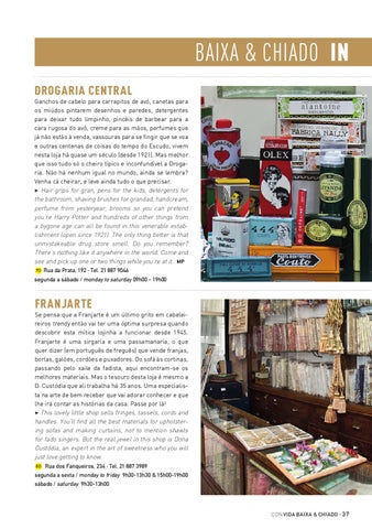 BAIXA & CHIADO IN DROGARIA CENTRAL Ganchos de cabelo para carrapitos de avó, canetas para os miúdos pintarem desenhos e paredes, detergentes para deixar tudo limpinho, pincéis de barbear para a cara rugosa do avô, creme para as mãos, perfumes que já não estão à venda, vassouras para se fingir que se voa e outras centenas de coisas do tempo do Escudo, vivem nesta loja há quase um século (desde 1921). Mas melhor que isso tudo só o cheiro típico e inconfundível a Drogaria. Não há nenhum igual no mundo, ainda se lembra? Venha cá cheirar, e leve ainda tudo o que precisar. 3 Hair grips for gran, pens for the kids, detergents for the bathroom, shaving brushes for grandad, handcream, perfume from yesteryear, brooms so you can pretend you’re Harry Potter and hundreds of other things from a bygone age can all be found in this venerable establishment (open since 1921). The only thing better is that unmistakeable drug store smell. Do you remember? There’s nothing like it anywhere in the world. Come and see and pick up one or two things while you’re at it. MP 7D