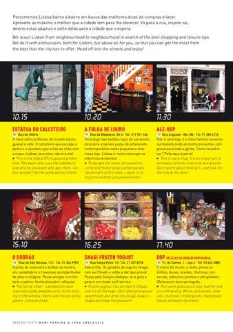 Percorremos Lisboa bairro a bairro em busca das melhores dicas de compras e lazer. Aproveite ao máximo o melhor que a cidade tem para lhe oferecer. Vá para a rua, inspire-se, devore estas páginas e salte delas para a cidade que o espera. We scour Lisbon from neighbourhood to neighbourhood in search of the best shopping and leisure tips. We do it with enthusiasm, both for Lisbon, but above all for you, so that you can get the most from the best that the city has to offer. Head off into the streets and enjoy!