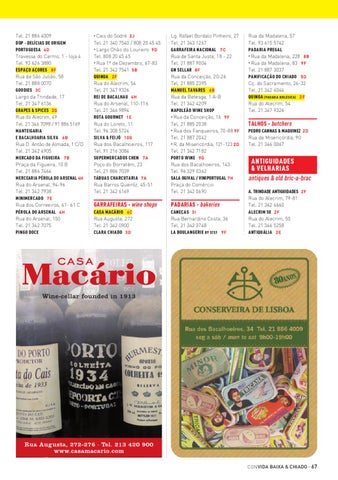do Sodré 2 J Tel. 21 340 7540 / 808 20 45 45 • Largo Chão do Loureiro 9 D Tel. 808 20 45 45 • Rua 1º de Dezembro, 67-83 Tel. 21 342 7541 5 B QUINOA 2 F Rua do Alecrim, 54 Tel. 21 347 9326 REI DE BACALHAU 4 H Rua do Arsenal, 110-116 Tel. 21 346 9894 ROTA GOURMET 1 E Rua do Loreto, 11 Tel. 96 308 5724 SILVA & FEIJÓ 1 0 G Rua dos Bacalhoeiros, 117 Tel. 91 216 3084 SUPERMERCADOS CHEN 7 A Poço do Borratém, 23 Tel. 21 886 7039 TÁBUAS CHARCUTARIA 7 A Rua Barros Queiróz, 45-51 Tel. 21 342 6169