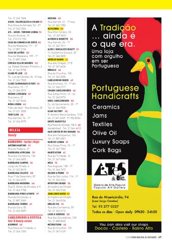 ADELINA 4 E Rua Garrett, 61 - 1º esq. Tel. 21 342 1982 ALFACINHA 3 H Rua Vítor Cordon, 35 Tel. 21 347 8231 ALFREDO & BIQUETTE 5 E Rua Garrett, 36 - 1º Tel. 21 342 7611 ALVES / GONÇALVES BEAUTY 2F Tv. Guilherme Coussul, 20 Tel. 21 346 0690 AURÉLIO RAMOS 1 E Rua das Chagas, 17 B Tel. 21 347 6434 BBNAILS 6 E Rua do Crucifixo, 105 Tel. 21 343 2005 CABELEIREIRO RENZO 4 F Rua Anchieta, 13 - 1º dto Tel. 21 346 2171 CHIADO CABELEIREIROS 4 E Rua Serpa Pinto, 12 - slj. Tel. 21 342 8774 GIBEL CABELEIREIROS 5 D Cç. do Sacramento, 38 - 1º Tel. 21 346 9558 GLAM FACTORY 3 G R. António Maria Cardoso, 15 B tel. 21 347 6269 · 91 956 8304 GRIFFE HAIRSTYLE Rua Nova do Almada, 100 A 6E (escadinhas) · Tel. 21 346 6410 HAIR CENTER BY RUI ROMANO 8E Rua dos Fanqueiros, 103 Tel. 21 887 4001 HAIRCUT LISBOA 3F Rua Serpa Pinto, 15 - 1º Tel. 21 347 7302 HAIRSTATION 4 C Rua da Trindade, 14 Tel. 21 347 4066 HECA 7 E Rua Augusta, 138 - 1º Tel. 21 346 7672 HELDER & PEDRO 7 F Rua de São Julião, 116 - 1º Tel. 21 346 0262 INTUITION CHIADO 5 E Armazéns do Chiado Tel. 21 324 5160 JEAN LOUIS DAVID 5 E Armazéns do Chiado Tel. 21 346 8104 KBELOS IVA 7 E Rua dos Correeiros, 59 Tel. 21 343 2112 LISOS & SEDOSOS 8 D Rua dos Douradores, 128 Tel. 21 888 8020 METROSTUDIO 6 E Rua do Crucifixo, 120 Tel. 21 347 4129 CON VIDA BAIX A & CHIADO ·