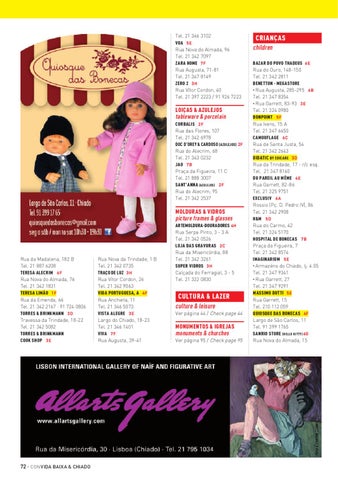 CRIANÇAS children BAZAR DO POVO THADEUS 6 E Rua do Ouro, 148-150 Tel. 21 342 2811 BENETTON - MEGASTORE • Rua Augusta, 285-295 6 B Tel. 21 347 8354 • Rua Garrett, 83-93 3 E Tel. 21 324 0980 BONPOINT 5 F Rua Ivens, 15 A Tel. 21 347 6650 CAMOUFLAGE 6 C Rua de Santa Justa, 54 Tel. 21 342 2643 DIDATIC BY EDICARE 3 D Rua da Trindade, 17 - r/c esq. Tel. 21 347 8160 DU PAREIL AU MÊME 4 E Rua Garrett, 82-86 Tel. 21 325 9751 EXCLUSIV 6 A Rossio (Pç. D. Pedro IV), 86 Tel. 21 342 2908 H&M 5 D Rua do Carmo, 42 Tel. 21 324 5170 HOSPITAL DE BONECAS 7 B Praça da Figueira, 7 Tel. 21 342 8574 IMAGINARIUM 5 E • Armazéns do Chiado, lj. 4.05 Tel. 21 347 9341 • Rua Garrett, 27 Tel. 21 347 9291 MASSIMO DUTTI 5 E Rua Garrett, 15 Tel. 210 112 059 QUIOSQUE DAS BONECAS 4F Largo de São Carlos, 11 Tel. 91 399 1765 SANRIO STORE (HELLO KITTY) 6G Rua Nova do Almada, 15