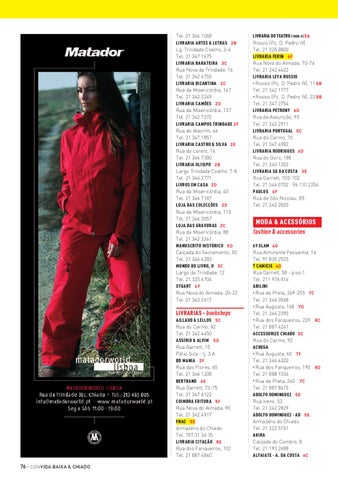 LIVRARIAS · bookshops AILLAUD & LELLOS 5 C Rua do Carmo, 82 Tel. 21 342 4450 ASSÍRIO & ALVIM 5 D Rua Garrett, 10 Pátio Siza - lj. 3 A BD MANIA 2 F Rua das Flores, 65 Tel. 21 346 1208 BERTRAND 4 E Rua Garrett, 73-75 Tel. 21 347 6122 COIMBRA EDITORA 5 F Rua Nova do Almada, 90 Tel. 21 342 4917 FNAC 5 E Armazéns do Chiado Tel. 707 31 34 35 LIVRARIA CITAÇÃO 8 E Rua dos Fanqueiros, 102 Tel. 21 887 4840