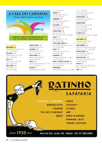 Tel. 21 343 2015 PEPE JEANS 5E Rua Nova do Almada, 110 Tel. 21 325 9004 PICCADILLY 4E Rua Anchieta, 29 ·1º dto. Tel. 21 342 6721 PITTA 6D Rua Augusta, 195-197 Tel. 21 342 7526 PULL & BEAR 5E Rua Garrett, 14 Tel. 21 318 3900