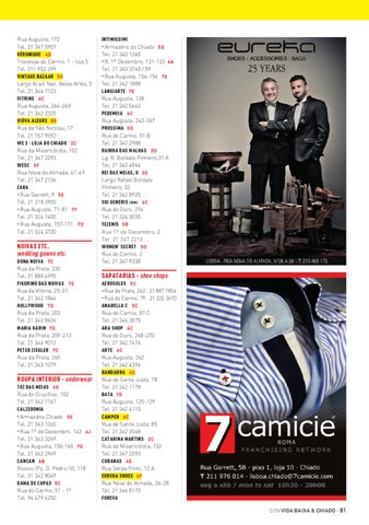 Rua Augusta, 172 Tel. 21 347 5907 VÉRONIQUE 4D Travessa do Carmo, 1 - loja 5 Tel. 211 952 299 VINTAGE BAZAAR 5G Largo Acad. Nac. Belas Artes, 5 Tel. 21 346 7123 VITRINE 6C Rua Augusta, 264-268 Tel. 21 342 2325 VIÚVA ALEGRE 8E Rua de São Nicolau, 17 Tel. 21 157 9592 WE 3 - LOJA DO CHIADO 2C Rua da Misericórdia, 102 Tel. 21 347 2293 WESC 5F Rua Nova do Almada, 47-49 Tel. 21 347 2136 ZARA • Rua Garrett, 9 5E Tel. 21 318 3900 • Rua Augusta, 71-81 7F Tel. 21 324 1400 • Rua Augusta, 157-171 7D Tel. 21 324 3720