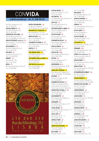 CAFÉ NO CHIADO 3 F Largo do Picadeiro, 10-12 Tel. 21 346 0501 CAFÉ ROYALE 3 D Lg. Rafael Bordalo Pinheiro, 29 Tel. 21 346 9125 CAFÉ TATI 1 H Rua da Ribeira Nova, 36 Tel. 21 346 1279 CAFETARIA MUSEU S. ROQUE 2 B Largo Trindade Coelho Tel. 21 323 5065 CAIS DO CHIADO 2 G Rua do Alecrim, 26 M Tel. 21 343 1072 CANTINHO DO AVILLEZ 3 H Rua Duques Bragança, 7 Tel. 21 199 2369 CASA ALCOBAÇA 3 C Rua Oliveira ao Carmo, 9 Tel. 21 342 6848 CASA DA MÓ 8 AB Rua Condes de Monsanto, 1 Tel. 21 887 2095 CASTIÇO 6 E Rua dos Sapateiros, 81 Tel. 21 342 7403 CERVEIRENSE, O 6 F Rua Nova do Almada, 38-40 Tel. 21 343 3589 CERVEJARIA TRINDADE 3 C Rua Nova da Trindade, 20 C Tel. 21 342 3506 / 93 990 0844 CESTEIRO 7 C Rua dos Correeiros, 225 Tel. 21 342 8731 CHAMINÉS DO PALÁCIO 6 A Palácio da Independência, Largo de São Domingos, 11 Tel. 21 324 1470 / 91 945 0754 CHARCUTARIA CHIADO, A 2 G Rua do Alecrim, 47 A Tel. 21 342 3845 CHEZ DEGROOTTE 3 H Rua Duques de Bragança, 4 Tel. 21 347 2839 CHIMARRÃO 5 E Armazéns do Chiado, lj. 6.01 Tel. 21 347 9444 CLARA CHIADO 3 D Lg. Rafael Bordalo Pinheiro, 27 Tel. 21 343 1267 COLCCI CAFÉ 5 E Rua Ivens, 59-61 - 1º Tel. 21 099 1613 CONCHA D’OURO 6 C Rua Augusta, 238 Tel. 21 342 8369 CONFEITARIA NACIONAL 7 B Praça da Figueira, 18 Tel. 21 342 4470 DAS FLORES 2 G Rua das Flores, 76-78