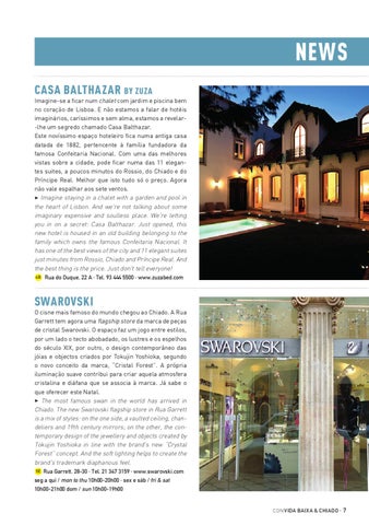 SWAROVSKI O cisne mais famoso do mundo chegou ao Chiado. A Rua Garrett tem agora uma flagship store da marca de peças de cristal Swarovski. O espaço faz um jogo entre estilos, por um lado o tecto abobadado, os lustres e os espelhos do século XIX, por outro, o design contemporâneo das jóias e objectos criados por Tokujin Yoshioka, segundo o novo conceito da marca, “Cristal Forest”. A própria iluminação suave contribui para criar aquela atmosfera cristalina e diáfana que se associa à marca. Já sabe o que oferecer este Natal. 3 The most famous swan in the world has arrived in Chiado. The new Swarovski flagship store in Rua Garrett is a mix of styles: on the one side, a vaulted ceiling, chandeliers and 19th century mirrors; on the other, the contemporary design of the jewellery and objects created by Tokujin Yoshioka in line with the brand's new “Crystal Forest” concept. And the soft lighting helps to create the brand's trademark diaphanous feel. 5E