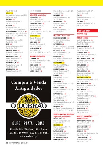 Rua dos Douradores, 214-216 Tel. 21 887 3839 INDIA GATE 6 E Rua dos Sapateiros, 126 Tel. 21 346 9797 INDIAN PALACE 4 D Largo do Carmo, 16 Tel. 21 342 4503 NATRAJ 6 D Rua dos Sapateiros, 171 Tel. 21 346 8113