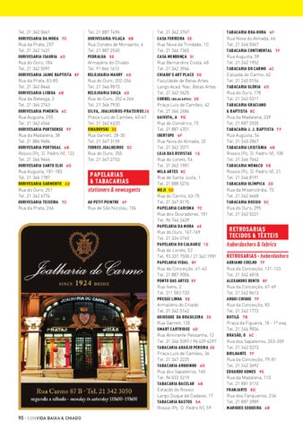 Tel. 21 342 3767 CASA FERREIRA 3 E Rua Nova da Trindade, 1C Tel. 21 346 7365 CASA MENDONÇA 3 I Rua Bernardino Costa, 48 Tel. 21 342 3964 CHIADO’S ART PLACE 5 G Faculdade de Belas Artes Largo Acad. Nac. Belas Artes Tel. 21 342 0625 CORBEL (BELAS ARTES) 2 E Praça Luís de Camões, 42 Tel. 21 346 2684 GAIVOTA, A 9 G Rua do Comércio, 15 Tel. 21 887 4701 IBERTOPE 6 F Rua Nova do Almada, 32 Tel. 21 342 2071 LOJA DAS REVISTAS 1 E Rua do Loreto, 54 Tel. 21 342 1981 MILA ARTES 8 C Rua de Santa Justa, 1 Tel. 21 888 5276 MUJI 5 D Rua do Carmo, 63-75 Tel. 21 347 8115 PAPELARIA CARISMA 7 C Rua dos Douradores, 181 Tel. 96 744 2429 PAPELARIA DA MODA 6 E Rua do Ouro, 167-169 Tel. 21 324 0740 PAPELARIA DO CALHARIZ 1 E Rua do Loreto, 52 Tel. 93 337 7508 / 21 342 1981 PAPELARIA VIDAL 8 F Rua da Conceição, 41-43 Tel. 21 887 9006 PONTO DAS ARTES 5 F Rua Ivens, 2 Tel. 211 583 720 PRESSE LINHA 5 E Armazéns do Chiado Tel. 21 342 5142 QUIOSQUE DA BRASILEIRA 3 E Rua Garrett, 120 SMART CARTRIDGE 4 D Rua Almirante Pessanha, 12 Tel. 21 346 5397 / 96 429 6297 TABACARIA ARAÚJO PEREIRA 2E Praça Luís de Camões, 36 Tel. 21 347 2225 TABACARIA ARQUINHO 6 D Rua dos Sapateiros, 160 Tel. 96 033 5219 TABACARIA BACELAR 4 B Estação do Rossio Largo Duque de Cadaval, 17 TABACARIA BASTOS 5 A Rossio (Pç. D. Pedro IV), 59