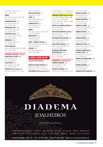 R. Douradores, 11 - 2º sala 206 Tel. 91 910 2006 / 96 430 6378 GERMANO DE SOUSA ANÁLISES CLÍNICAS • Rua Antº Maria Cardoso 3G 15-2º · Tel. 21 346 8384 • Estácio Saúde - Rossio, 60 5B Tel. 21 321 1390 HOSPITAL DA ORDEM TERCEIRA 4 G Rua Serpa Pinto, 7 Tel. 21 323 0300 INSTITUTO MACROBIÓTICO (IMP) 4F Rua Anchieta, 5 - 2º esq. Tel. 21 324 2290 ORTOPEDIA BAIXA AZEVEDOS 5B Rua 1º de Dezembro, 43 Tel. 21 347 1100 SANO-TÉCNICA MEDICAL 5 F Rua Nova do Almada, 61 Tel. 21 321 9394 SOCIEDADE PORTUGUESA DE NATURALOGIA 2 F Rua do Alecrim, 38 - 3º Tel. 21 346 3335