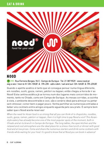 Quando o apetite asiático é tanto que só consegue pensar numa língua diferente, em noodles, sushi, gyoza, ramen, yakitori ou teppan, então chegou a hora de ir ao Nood! Esta cantina asiática já se tornou num dos lugares mais concorridos do momento, tanto no Chiado, como em Campo de Ourique. As mesas corridas, a cozinha à vista, o ambiente descontraído e cool, são o cenário ideal para almoçar ou jantar sem stressar, comer bem e pagar pouco. Venha partilhar as numerosas entradas e beber uns cocktails entre amigos enquanto aguarda pelo seu prato. É sempre bom saber que o Nood aceita reservas! When the need for Asian food is so strong that all you can think of is chopsticks, noodles, sushi, gyoza, ramen, yakitori or teppan, then it is high time to pay Nood a visit! This Asianstyle eatery has already become one of the most popular spots of the moment, both in Chiado and at its branch in Campo de Ourique. The long tables, the open kitchen and the relaxed and cool atmosphere are the ideal place for a stress-free lunch or dinner with good food and at low prices. Come and share the numerous starters and drink some cocktails with friends while waiting for your food. It’s good to know that at Nood you can book in advance!
