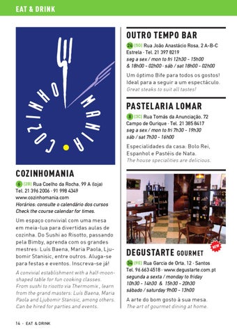 Um espaço convivial com uma mesa em meia-lua para divertidas aulas de cozinha. Do Sushi ao Risotto, passando pela Bimby, aprenda com os grandes mestres: Luís Baena, Maria Paola, Ljubomir Stanisic, entre outros. Aluga-se para festas e eventos. Inscreva-se já! A convivial establishment with a half-moonshaped table for fun cooking classes. From sushi to risotto via Thermomix , learn from the grand masters: Luís Baena, Maria Paola and Ljubomir Stanisic, among others. Can be hired for parties and events. 14 · EAT & DRINK