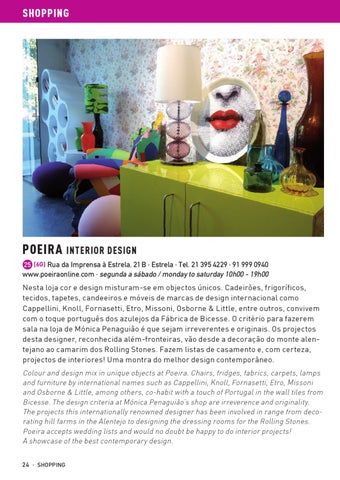 Nesta loja cor e design misturam-se em objectos únicos. Cadeirões, frigoríficos, tecidos, tapetes, candeeiros e móveis de marcas de design internacional como Cappellini, Knoll, Fornasetti, Etro, Missoni, Osborne & Little, entre outros, convivem com o toque português dos azulejos da Fábrica de Bicesse. O critério para fazerem sala na loja de Mónica Penaguião é que sejam irreverentes e originais. Os projectos desta designer, reconhecida além-fronteiras, vão desde a decoração do monte alentejano ao camarim dos Rolling Stones. Fazem listas de casamento e, com certeza, projectos de interiores! Uma montra do melhor design contemporâneo. Colour and design mix in unique objects at Poeira. Chairs, fridges, fabrics, carpets, lamps and furniture by international names such as Cappellini, Knoll, Fornasetti, Etro, Missoni and Osborne & Little, among others, co-habit with a touch of Portugal in the wall tiles from Bicesse. The design criteria at Mónica Penaguião’s shop are irreverence and originality. The projects this internationally renowned designer has been involved in range from decorating hill farms in the Alentejo to designing the dressing rooms for the Rolling Stones. Poeira accepts wedding lists and would no doubt be happy to do interior projects! A showcase of the best contemporary design. 24 · SHOPPING