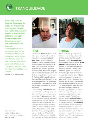 Cada bairro é feito de histórias. Do passado, das casas, dos monumentos e das pessoas. São elas que constroem a paisagem genuína, a personalidade própria de cada lugar. Esta é uma pequena homenagem a quem vive este bairro no seu dia-a-dia. Every neighbourhood is constructed from stories. Of the past, of houses, of monuments and of people. It is they who create the real landscape, the distinct personality of each place. This a short tribute to those for whom this neighbourhood is home. Com o apoio da Tranquilidade