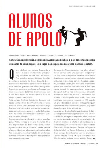 uem não ficou com vontade de aprender a dançar depois de ver no cinema Dirty Dancing ou o mais recente Shall We Dance? Pois quando o assunto é danças de salão, a escola que se impõe é a Alunos de Apolo. É desta sociedade filarmónica centenária que todos os anos saem os grandes dançarinos portugueses. Encontram-se aqui os melhores professores e os mais conceituados bailarinos de competição, mas a vida desta escola vai muito além das aulas de tango, salsa ou cha-cha-cha. Toda a magia histórica dos Alunos de Apolo está ligada a uma cultura de entretenimento que junta todas as idades. Uma raridade nos dias de hoje. Por isso, esta instituição é uma escola, uma sociedade recreativa, um espaço de reunião. Os finais de tarde no edifício característico de Campo de Ourique são disso exemplo. Quando se aproxima a hora de começar as aulas, pelas 19h00, começa o rodopio de alunos. Para trás da porta fica o dia de trabalho e o mau humor. Agora é hora de dançar. Entre as classes, sempre cheias, estão desde adolescentes até reformados. Aos pares, como manda a tradição. Os familiares e curiosos assistem ao desempenho dos aprendizes nas mesas circundantes.