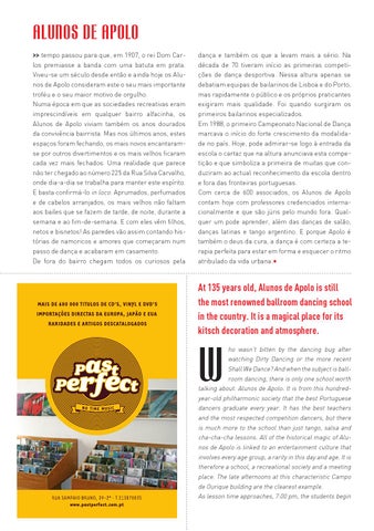 talking about: Alunos de Apolo. It is from this hundredyear-old philharmonic society that the best Portuguese dancers graduate every year. It has the best teachers and the most respected competition dancers, but there is much more to the school than just tango, salsa and cha-cha-cha lessons. All of the historical magic of Alunos de Apolo is linked to an entertainment culture that involves every age group, a rarity in this day and age. It is therefore a school, a recreational society and a meeting place. The late afternoons at this characteristic Campo de Ourique building are the clearest example. As lesson time approaches, 7.00 pm, the students begin
