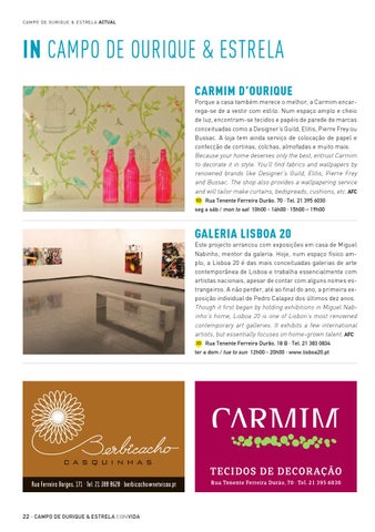 IN campo de ourique & estrela Carmim d’Ourique Porque a casa também merece o melhor, a Carmim encarrega-se de a vestir com estilo. Num espaço amplo e cheio de luz, encontram-se tecidos e papéis de parede de marcas conceituadas como a Designer’s Guild, Elitis, Pierre Frey ou Bussac. A loja tem ainda serviço de colocação de papel e confecção de cortinas, colchas, almofadas e muito mais. Because your home deserves only the best, entrust Carmim to decorate it in style. You’ll find fabrics and wallpapers by renowned brands like Designer’s Guild, Elitis, Pierre Frey and Bussac. The shop also provides a wallpapering service and will tailor make curtains, bedspreads, cushions, etc. AFC 5D