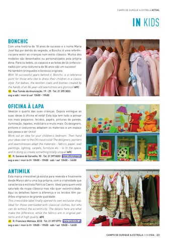 IN kids Bonchic Com uma história de 18 anos de sucesso e o nome Maria José Vaz por detrás do segredo, a Bonchic é uma referência para vestir as crianças num estilo clássico. Muitos dos modelos são desenhados ou personalizados pela própria dona. Para os bebés, os casacos e as botas de lã confeccionados por uma costureira de 86 anos são um sucesso! Há também brinquedos e bonecos originais. With 18 successful years behind it, Bonchic is a reference point for those who like to dress their children in a classic style. For babies, the woollen coats and booties created by the hands of an 86-year-old seamstress are glorious! AFC 5D