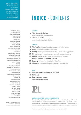 AGRADECIMENTOS · ACKNOWLEDGEMENTS Um especial agradecimento a Miguel Sousa Tavares pelo artigo “Viva Campo de Ourique”, a Evelyn Kahn, que continua incansavelmente a contribuir com o seu talento e com a suas fotografias, a Margarida Xara-Brasil, aos nossos colaboradores, à equipa ConVida e a todos os anunciantes que apostaram nesta primeira edição com confiança e entusiasmo. Caso encontre uma incorrecção ou omissão, agradecemos que nos contacte.