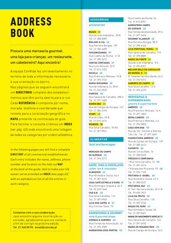 uma loja para crianças, um restaurante, um cabeleireiro? Aqui encontra! A equipa ConVida fez um levantamento no terreno de toda a informação necessária à sua orientação no bairro. Nas páginas que se seguem encontrará um directório completo dos estabelecimentos que têm porta aberta para a rua. Cada referência é composta por nome, morada, telefone e coordenada que remete para a localização geográfica no mapa presente na contracapa do guia. Para facilitar a consulta criámos um index (ver pág. 63) onde encontrará uma listagem