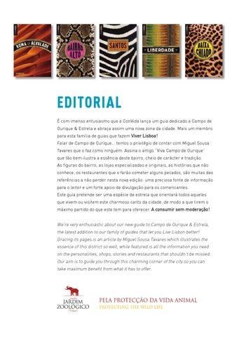 EDITORIAL É com imenso entusiasmo que a ConVida lança um guia dedicado a Campo de Ourique & Estrela e abraça assim uma nova zona da cidade. Mais um membro para esta família de guias que fazem Viver Lisboa ! Falar de Campo de Ourique… temos o privilégio de contar com Miguel Sousa Tavares que o faz como ninguém. Assina o artigo “Viva Campo de Ourique” que tão bem ilustra a essência deste bairro, cheio de carácter e tradição. As figuras do bairro, as lojas especializadas e originais, as histórias que não conhece, os restaurantes que o farão cometer alguns pecados, são muitas das referências a não perder nesta nova edição: uma preciosa fonte de informação para o leitor e um forte apoio de divulgação para os comerciantes. Este guia pretende ser uma espécie de estrela que orientará todos aqueles que vivem ou visitem este charmoso canto da cidade, de modo a que tirem o máximo partido do que este tem para oferecer. A consumir sem moderação ! We’re very enthusiastic about our new guide to Campo de Ourique & Estrela, the latest addition to our family of guides that let you Live Lisbon better! Gracing its pages is an article by Miguel Sousa Tavares which illustrates the essence of this district so well, while featured is all the information you need on the personalities, shops, stories and restaurants that shouldn’t be missed. Our aim is to guide you through this charming corner of the city so you can take maximum benefit from what it has to offer.