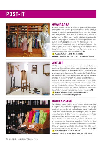 Artlier Cliché ou não, o saber não ocupa mesmo lugar. Neste escondido e típico pátio do bairro, pode desenvolver novos conhecimentos através de workshops, ateliês e cursos de curta e longa duração. Restauro e Reciclagem de Móveis, Pintura com História e Teatro são algumas das opções. Para as crianças há também várias formações e festas temáticas. Cliché or not, knowledge knows no bounds. In this hidden courtyard, you can develop new talents via workshops, studios and long and short courses. Furniture restoration and recycling, history painting and theatre are some of the options. For children, there are also various themed courses. Afc 2F