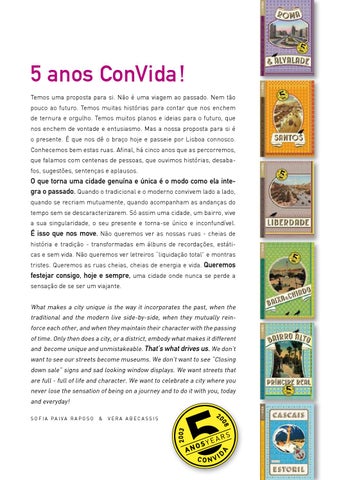 5 anos ConVida ! Temos uma proposta para si. Não é uma viagem ao passado. Nem tão pouco ao futuro. Temos muitas histórias para contar que nos enchem de ternura e orgulho. Temos muitos planos e ideias para o futuro, que nos enchem de vontade e entusiasmo. Mas a nossa proposta para si é o presente. É que nos dê o braço hoje e passeie por Lisboa connosco. Conhecemos bem estas ruas. Afinal, há cinco anos que as percorremos, que falamos com centenas de pessoas, que ouvimos histórias, desabafos, sugestões, sentenças e aplausos.