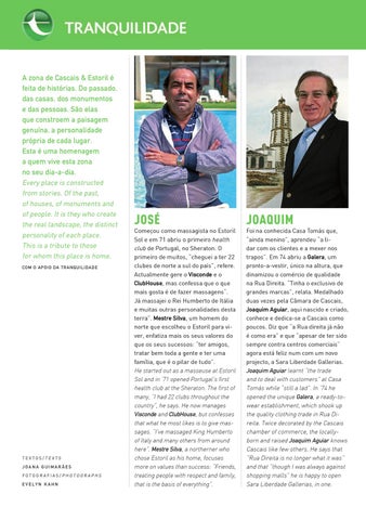 A zona de Cascais & Estoril é feita de histórias. Do passado, das casas, dos monumentos e das pessoas. São elas que constroem a paisagem genuína, a personalidade própria de cada lugar. Esta é uma homenagem a quem vive esta zona no seu dia-a-dia. Every place is constructed from stories. Of the past, of houses, of monuments and of people. It is they who create the real landscape, the distinct personality of each place. This is a tribute to those for whom this place is home. Com o apoio da Tranquilidade