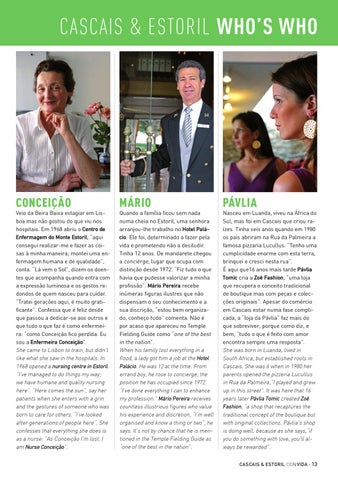 Nasceu em Luanda, viveu na África do Sul, mas foi em Cascais que criou raízes. Tinha seis anos quando em 1980 os pais abriram na Rua da Palmeira a famosa pizzaria Lucullus. “Tenho uma cumplicidade enorme com esta terra, brinquei e cresci nesta rua”. É aqui que16 anos mais tarde Pávlia Tomic cria a Zoë Fashion, “uma loja que recupera o conceito tradicional de boutique mas com peças e colecções originais”. Apesar do comércio em Cascais estar numa fase complicada, a “loja da Pávlia” faz mais do que sobreviver, porque como diz, e bem, “tudo o que é feito com amor encontra sempre uma resposta”. She was born in Luanda, lived in South Africa, but established roots in Cascais. She was 6 when in 1980 her parents opened the pizzeria Lucullus in Rua da Palmeira,“I played and grew up in this street”. It was here that 16 years later Pávlia Tomic created Zoë Fashion, “a shop that recaptures the traditional concept of the boutique but with original collections. Pávlia’s shop is doing well, because as she says,“if you do something with love, you’ll always be rewarded”. cascais & estoril con vida · 13