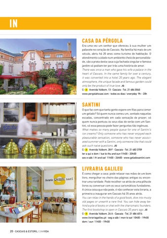 in Casa da Pérgola Era uma vez um senhor que ofereceu à sua mulher um palacete no coração de Cascais. Na família há mais de um século, abriu há 20 anos como turismo de habitação. O atendimento cuidado num ambiente cheio de personalidade, são a prata desta casa cuja fachada singular e famoso jardim só podiam ter por trás uma história de amor. There was once a man who gave his wife a palace in the heart of Cascais. In the same family for over a century, it was converted into a hotel 20 years ago. The elegant atmosphere, the unique facade and famous garden could only be the product of true love. JG C-