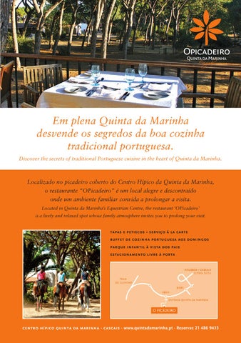 Localizado no picadeiro coberto do Centro Hípico da Quinta da Marinha, o restaurante “OPicadeiro” é um local alegre e descontraído onde um ambiente familiar convida a prolongar a visita. Located in Quinta da Marinha’s Equestrian Centre, the restaurant ‘OPicadeiro’ is a lively and relaxed spot whose family atmosphere invites you to prolong your visit. tapas e petiscos • serviço à la carte buffet de cozinha portuguesa aos domingos parque infantil à vista dos pais estacionamento livre à porta