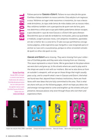 Faltava percorrer Cascais e Estoril. Faltava na sua colecção dos guias ConVida e faltava também no nosso caminho. Esta edição é um regresso a casa. Voltámos ao lugar onde nascemos e crescemos, às ruas e becos onde brincámos, às lojas onde íamos de mãos dadas com as nossas mães. Mas voltámos também com a perspectiva de quem vem de fora, para nos determos a olhar para o que pelo hábito poderíamos deixar escapar, e para descobrir o que de novo Cascais e o Estoril têm para oferecer. Descobrimos que ao lado de verdadeiras instituições, pela sua qualidade e tradição, surgem pessoas novas, com projectos inovadores, apostadas em dar o melhor de si a esta terra. É tudo isso que partilhamos consigo nestas páginas, onde esperamos que mergulhe e saia revigorado para vir animar as ruas com a sua presença, porque os sítios só existem através de quem os olha e de quem os vive.