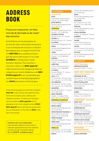 à sua orientação em Cascais e no Estoril. Nas páginas que se seguem encontrará um directório dos estabelecimentos que têm porta aberta para a rua. Cada referência é composta por nome, morada e telefone. Para facilitar a consulta criámos um index (página 86) onde encontrará uma listagem de todas as categorias por ordem alfabética e um index de ruas (página 87) com coordenadas que remetem para a localização geográfica nos mapaS presentes no final do guia.