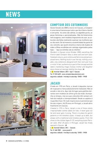 Jacadi Criada em 1976 em Paris, a Jacadi é daquelas marcas de roupa para criança absolutamente inatacável. Não se excede e não erra. Aqui não há lugar para padrões berrantes nem modelos do último grito da moda. Acompanha os tempos, mas as suas colecções têm sempre um halo de tradição e intemporalidade. Desde os sapatos à roupa (dos 0 aos 12), tudo respira esse ar parisiense que lhe deu origem. Há 20 anos em Portugal, a Jacadi abriu finalmente em Cascais. Created in 1976 in Paris, Jacadi is one of those utterly irreproachable clothes labels for kids. It never goes too far and never gets it wrong. There’s no place for garish patterns or the trendiest styles. It keeps up to date, but always with a traditional and timeless quality. From the shoes to the clothes (ages 0-12), everything oozes Parisian style. After 20 years in Portugal, Jacadi has finally opened in Cascais. JG C- 2I