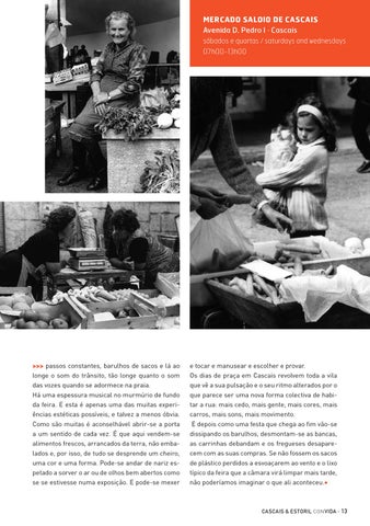 e tocar e manusear e escolher e provar. Os dias de praça em Cascais revolvem toda a vila que vê a sua pulsação e o seu ritmo alterados por o que parece ser uma nova forma colectiva de habitar a rua: mais cedo, mais gente, mais cores, mais carros, mais sons, mais movimento. E depois como uma festa que chega ao fim vão-se dissipando os barulhos, desmontam-se as bancas, as carrinhas debandam e os fregueses desaparecem com as suas compras. Se não fossem os sacos de plástico perdidos a esvoaçarem ao vento e o lixo típico da feira que a câmara virá limpar mais tarde, não poderíamos imaginar o que ali aconteceu.•