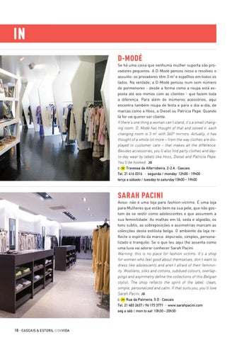 Bairro alto & príncipe real D-modé Se há uma coisa que nenhuma mulher suporta são provadores pequenos. A D-Modé pensou nisso e resolveu o assunto: os provadores têm 3 m2 e espelhos em todos os lados. Na verdade, a D-Modé pensou num sem número de pormenores - desde a forma como a roupa está exposta até aos mimos com as clientes - que fazem toda a diferença. Para além de inúmeros acessórios, aqui encontra também roupa de festa e para o dia-a-dia, de marcas como a Hoss, a Diesel ou Patricia Pepe. Quando lá for vai querer ser cliente. If there’s one thing a woman can’t stand, it’s a small changing room. D. Modé has thought of that and solved it: each changing room is 3 m2 with 360º mirrors. Actually, it has thought of a whole lot more – from the way clothes are displayed to customer care – that makes all the difference. Besides accessories, you’ll also find party clothes and dayto-day wear by labels like Hoss, Diesel and Patricia Pepe. You’ll be hooked. jg C- 3G
