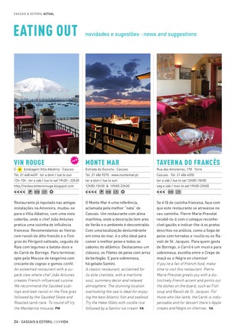 O Monte Mar é uma referência, aclamada pela melhor “nata” de Cascais. Um restaurante com alma marítima, onde a decoração tem ares de Verão e o ambiente é descontraído. Com uma localização deslumbrante em cima do mar, é o sítio ideal para comer o melhor peixe e todos os sabores do atlântico. Destacamos um clássico, os Filetes de peixe com arroz de berbigão. E para sobremesa, há gelado Santini. A classic restaurant, acclaimed for its elite clientele, with a maritime soul, summery decor and relaxed atmosphere. The stunning location overlooking the sea is ideal for enjoying the best Atlantic fish and seafood. Try the Hake fillets with cockle rice followed by a Santini ice cream. VA