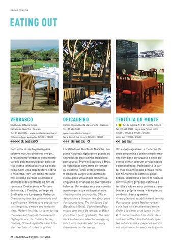 Um espaço agradável e moderno qb onde predomina a cozinha mediterrânea com base portuguesa e onde podemos contar com um serviço rápido e personalizado. Pode pedir à la carte, mas ao almoço não perca o menu por E12 (prato de carne ou peixe, bebida, sobremesa e café). O habitual convívio entre gerações estimula a tertúlia e não é raro a conversa transbordar a própria mesa. Não é preciso combinar, basta aparecer. A very pleasant establishment serving Portuguese-based Mediterraneanstyle food with an attentive service. Order à la carte, or at lunch try the €12 menu (meat or fish, drink, dessert and coffee). The habitual repartee enhances the experience and it’s not uncommon for everyone to join in.