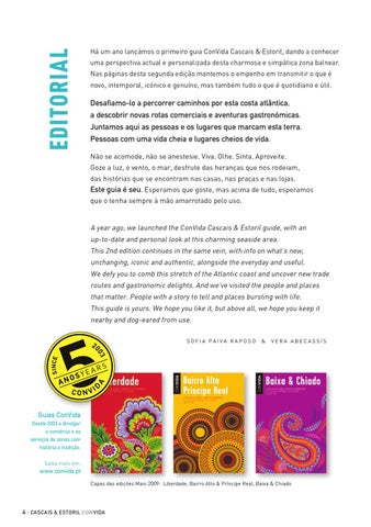 A year ago, we launched the ConVida Cascais & Estoril guide, with an up-to-date and personal look at this charming seaside area. This 2nd edition continues in the same vein, with info on what’s new, unchanging, iconic and authentic, alongside the everyday and useful. We defy you to comb this stretch of the Atlantic coast and uncover new trade routes and gastronomic delights. And we’ve visited the people and places that matter. People with a story to tell and places bursting with life. This guide is yours. We hope you like it, but above all, we hope you keep it nearby and dog-eared from use. S o f i a P a i va R aposo