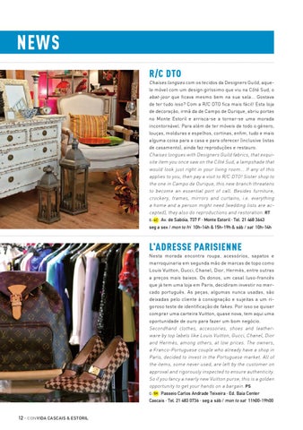 L'Adresse Parisienne Nesta morada encontra roupa, acessórios, sapatos e marroquinaria em segunda mão de marcas de topo como Louis Vuitton, Gucci, Chanel, Dior, Hermès, entre outras a preços mais baixos. Os donos, um casal luso-francês que já tem uma loja em Paris, decidiram investir no mercado português. As peças, algumas nunca usadas, são deixadas pelo cliente à consignação e sujeitas a um rigoroso teste de identificação de fakes. Por isso se quiser comprar uma carteira Vuitton, quase nova, tem aqui uma oportunidade de ouro para fazer um bom negócio. Secondhand clothes, accessories, shoes and leatherware by top labels like Louis Vuitton, Gucci, Chanel, Dior and Hermès, among others, at low prices. The owners, a Franco-Portuguese couple who already have a shop in Paris, decided to invest in the Portuguese market. All of the items, some never used, are left by the customer on approval and rigorously inspected to ensure authenticity. So if you fancy a nearly new Vuitton purse, this is a golden opportunity to get your hands on a bargain. PS C- 5H