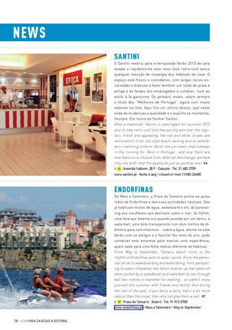 news santini O Santini reabriu para a temporada Verão 2010 de cara lavada e rapidamente este novo look retro-cool vence qualquer reacção de nostalgia dos habitués da casa. O espaço está fresco e convidativo, com largas riscas encarnadas e brancas a fazer lembrar um toldo de praia à antiga e as fardas dos empregados a condizer, num ao estilo à la garçonne. Os gelados, esses, valem sempre o título dos “Melhores de Portugal”, agora com novos sabores na lista. Aqui fica um último desejo: que nesta onda de mudanças a qualidade e o espírito se mantenha. Sempre. Em honra do Senhor Santini. After a makeover, Santini is open again for summer 2010 and its new retro-cool look has quickly won over the regulars. Fresh and appealing, the red and white stripes are reminiscent of an old-style beach awning and its attendant’s matching uniform. As for the ice cream, that’s always in the running for ‘Best in Portugal’, and now there are new flavours to choose from. After all the change, we have only one wish: that the quality be just as good as ever. va C- 21