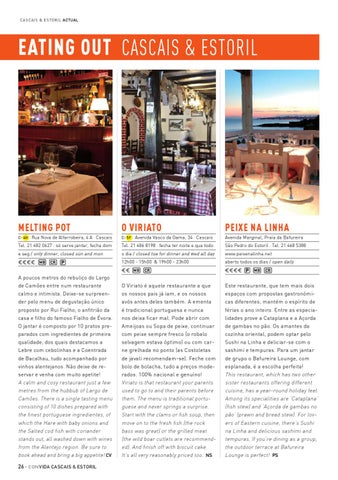 A poucos metros do rebuliço do Largo de Camões entre num restaurante calmo e intimista. Deixe-se surpreender pelo menu de degustação único proposto por Rui Fialho, o anfitrião da casa e filho do famoso Fialho de Évora. O jantar é composto por 10 pratos preparados com ingredientes de primeira qualidade, dos quais destacamos a Lebre com cebolinhas e a Coentrada de Bacalhau, tudo acompanhado por vinhos alentejanos. Não deixe de reservar e venha com muito apetite! A calm and cosy restaurant just a few metres from the hubbub of Largo de Camões. There is a single tasting menu consisting of 10 dishes prepared with the finest portuguese ingredientes, of which the Hare with baby onions and the Salted cod fish with coriander stands out, all washed down with wines from the Alentejo region. Be sure to book ahead and bring a big appetite! CV 26 · con vida CASCAIS & ESTORIL
