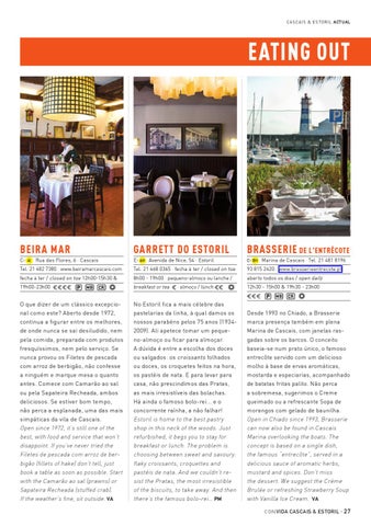 Desde 1993 no Chiado, a Brasserie marca presença também em plena Marina de Cascais, com janelas rasgadas sobre os barcos. O conceito baseia-se num prato único, o famoso entrecôte servido com um delicioso molho à base de ervas aromáticas, mostarda e especiarias, acompanhado de batatas fritas palito. Não perca a sobremesa, sugerimos o Creme queimado ou a refrescante Sopa de morangos com gelado de baunilha. Open in Chiado since 1993, Brasserie can now also be found in Cascais Marina overlooking the boats. The concept is based on a single dish, the famous “entrecôte”, served in a delicious sauce of aromatic herbs, mustard and spices. Don’t miss the dessert. We suggest the Crème Brulée or refreshing Strawberry Soup with Vanilla Ice Cream. VA con vida CASCAIS & ESTORIL · 27