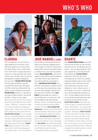 José Manuel E SARA Duarte Conversámos confortavelmente sentados junto à janela rasgada sobre o mar. O lugar é o histórico restaurante English Bar. É assim que toda a gente o conhece mas o seu nome completo é hoje, Cimas English Bar, uma homenagem à família Cima que lhe dedicou uma vida inteira e que inspirou os seus descendentes a prosseguir o feito. José Manuel Cima Sobral é um anfitrião como poucos e apesar de ser um filho da terra conserva bem vivas as suas raízes galegas. Desde há 10 anos que tem ao lado a filha, Sara Sobral, empenhada em cumprir o que também já é um sonho seu: dar continuidade a esta obra familiar. We talk, sitting comfortably beside the window looking onto the sea. We’re in Estoril’ historic Cimas English Bar Restaurant, a tribute to the Cima family who devoted their whole lives to it and who inspired their children to do the same. José Manuel Cima Sobral is the perfect host and though a local lad is proud of his Galician roots. His daughter, Sara Sobral, has worked alongside him for the last 10 years, endeavouring to fulfil what is also her dream: to keep the family business going.