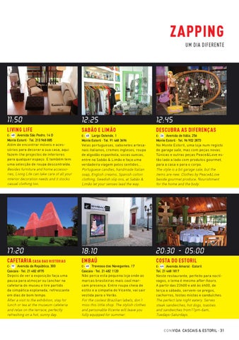 Cascais · Tel. 21 482 1120 Não perca esta pequena loja onde as marcas brasileiras mais cool marcam presença. Entre roupa cheia de estilo e a simpatia do Vicente, vai sair vestida para o Verão. For the coolest Brazilian labels, don’t miss this little shop. The stylish clothes and personable Vicente will leave you fully equipped for summer.