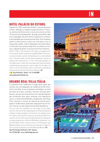 IN Hotel Palácio do Estoril Erguido em 1930, ainda hoje mantém o charme de outros tempos. Albergou a realeza europeia durante a II Guerra, estrelas da Sétima Arte e serviu de cenário ao filme “Ao Serviço de Sua Majestade” da saga James Bond. Mas nem a passagem dos anos retirou o glamour e a chancela de qualidade que caracteriza este hotel. Dos frondosos jardins à idílica piscina, suites com vista para o mar ou imponentes salões, tudo foi idealizado num estilo clássico. Nos dias mais quentes sabe bem um refresco no terraço, seguido de jantar no exclusivo Grill Four Seasons. Built in 1930, it still maintains the charm of a bygone era. It housed European royalty during World War II and movie stars and was used as the backdrop for a James Bond film. The years have not dimmed the glamour and air of quality that characterise it. From the leafy gardens to the idyllic pool, suites with sea views and imposing halls, everything was designed in classic style. On hot days, it’s nice to sit on the terrace with a cool drink followed by dinner at the exclusive Grill Four Seasons. PS E- 5G