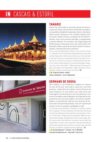 Germano de Sousa Para celebrar a sua existência e tradição em Cascais há mais de 30 anos, local onde a marca tem uma forte presença, o laboratório de análises clínicas Germano de Sousa inaugurou um novo espaço, que surge como uma homenagem à vila de Cascais e aos seus pacientes. Com montra convidativa sobre a Marginal, este laboratório traz, juntamente com uma nova imagem, uma melhor acessibilidade e um atendimento cada vez mais eficiente, de forma a estar mais perto das pessoas, mas com a postura de sempre: honrar a inovação, a qualidade e o rigor. To commemorate 30 years of tradition in Cascais, where the company is firmly implanted, the Germano de Sousa clinical test laboratory has opened a new facility in honour of the town of Cascais and its patients. With an inviting window display, the laboratory has a new image, better access and more efficient customer service with the result that it is even more customer-friendly than before while retaining the same old ethic: a modus operandi that honours innovation, quality and thoroughness. VA C- 1I