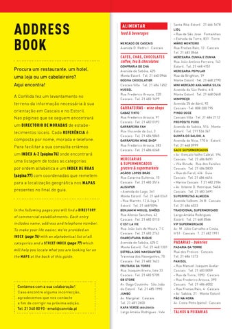 Aqui encontra! A ConVida fez um levantamento no terreno da informação necessária à sua orientação em Cascais e no Estoril. Nas páginas que se seguem encontrará um directório de moradas de estabelecimentos locais. Cada referência é composta por nome, morada e telefone. Para facilitar a sua consulta criámos um index A-Z (página 76) onde encontrará uma listagem de todas as categorias por ordem alfabética e um index de ruas (página 77) com coordenadas que remetem para a localização geográfica nos mapaS presentes no final do guia.