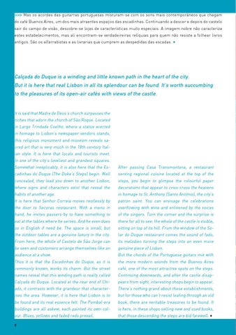 >>> Mas os acordes das guitarras portuguesas misturam-se com os sons mais contemporâneos que chegam do café Buenos Aires, um dos mais atraentes espaços das escadinhas. Continuando a descer e depois do castelo sair do campo de visão, descobre-se lojas de características muito especiais. A imagem nobre não caracteriza estes estabelecimentos, mas ali encontram-se verdadeireiras relíquias para quem não resiste a folhear livros antigos. São os alfarrabistas e as livrarias que cumprem as despedidas das escadas. •