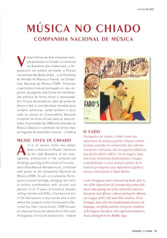 rt in its various forms has always been a feature of Chiado: literature at the Café Brasileira of the intelligentsia, architecture in the centuries-old buildings, painting at the school of fine arts... and in Rua Nova do Almada music, combined with poetry at the Companhia Nacional de Música (CNM). Its aim is to preserve Portuguese musical heritage, divulging this form of artistic manifestation with success and passion. In its 12 years of existence, besides selling records and DVDs, it has become one of the best places to buy scores and is also where the students of the Conservatório Nacional buy their course books. CNM focuses on classical music but above all on that most Portuguese of musical expressions - Fado.•